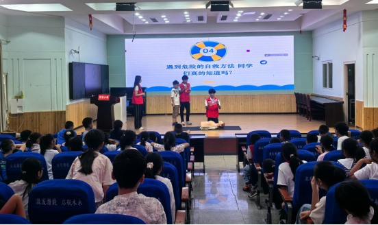 科普团队通过生动的讲解和互动环节向同学们介绍了溺水的危险性、如何识别危险水域以及遇到危险时的自救方法,带领大家学习防溺水安全守则。科普团队详细讲解了如何判断溺水者的生命体征及其正确的急救步骤,活动设置心肺复苏实操环节,由专业讲师现场演示并指导学生们进行实践操作。并邀请学生上台进行模拟演练。
