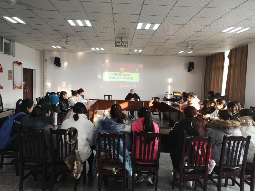 2020年12月21日下午4点,我院在笃行楼四栋410会议室召开了党总支书记联系班级座谈会。党总支书记杨岳与2018级体育教育5班全体同学一道畅所欲言共话未来。学院辅导员陈果老师、佘港老师、廖晋饶老师、2018级班主任黄敏老师参加了本次座谈会。