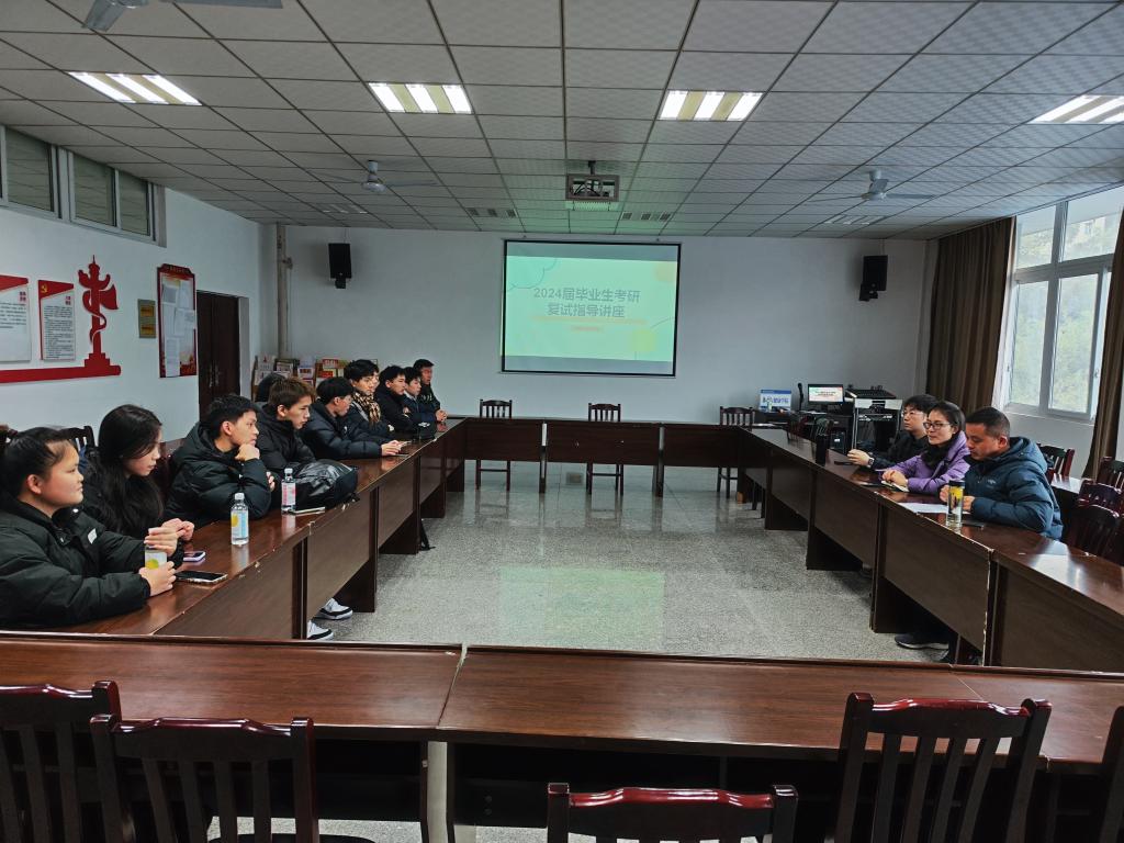 阳春三月,在春意盎然的校园里,我院2024届毕业生有近20名同学有望通过考研初试分数线。为帮助过线的同学顺利通过研究生复试,跨入心中理想的研究生学府,2024年3月6日,9728太阳集团举办考研复试指导讲座。我院党总支书记冉金鑫、副院长刘建宇、教师代表潘仲金、毕业班辅导员王翔和2024届部分毕业生参加。