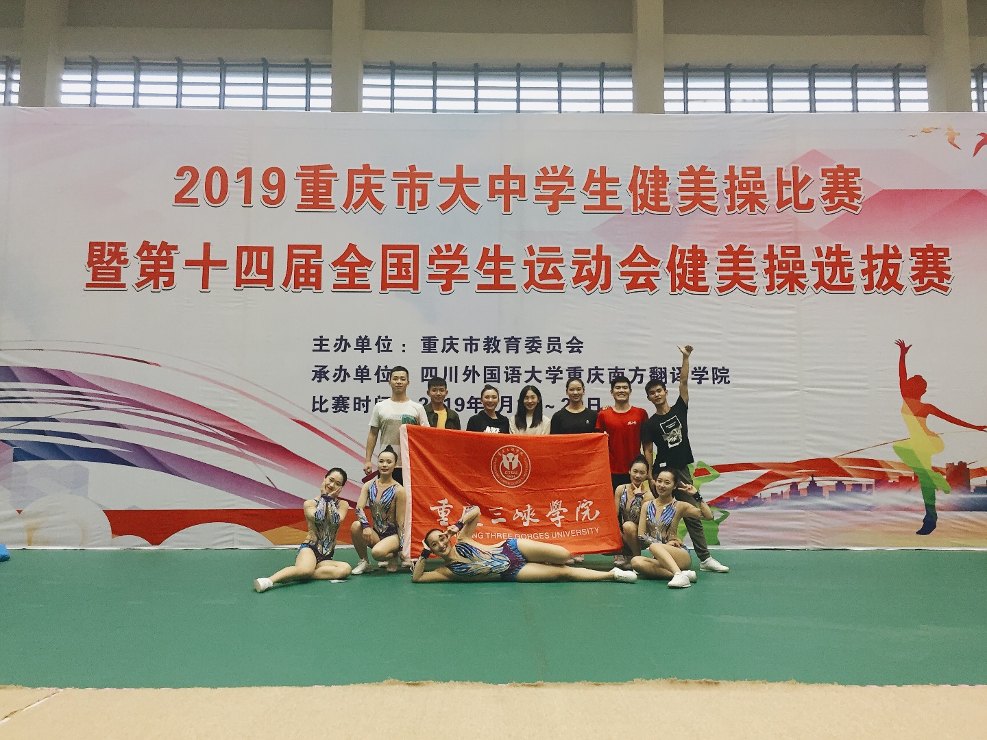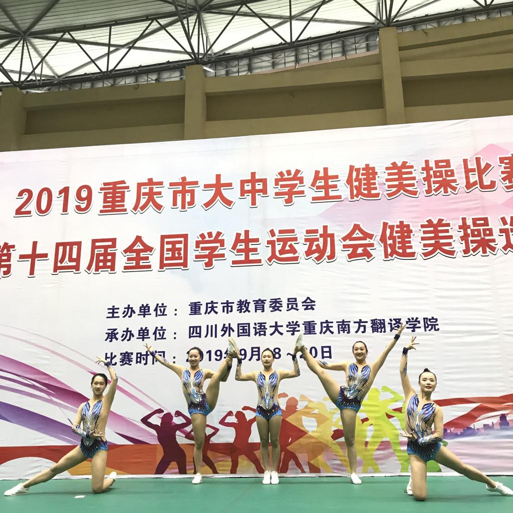2019年9月18至20日,由重庆市教育委员会主办、四川外国语大学重庆南方翻译学院承办的“2019重庆市大中学生健美操比赛暨第十四届全国学生运动会健美操选拔赛”在重庆綦江举行,我校9728太阳集团健美操队代表学校参加大学丙组比赛,取得了混双第一名;三人操第二名;男子单人操第二名:五人操第二名的优异成绩。