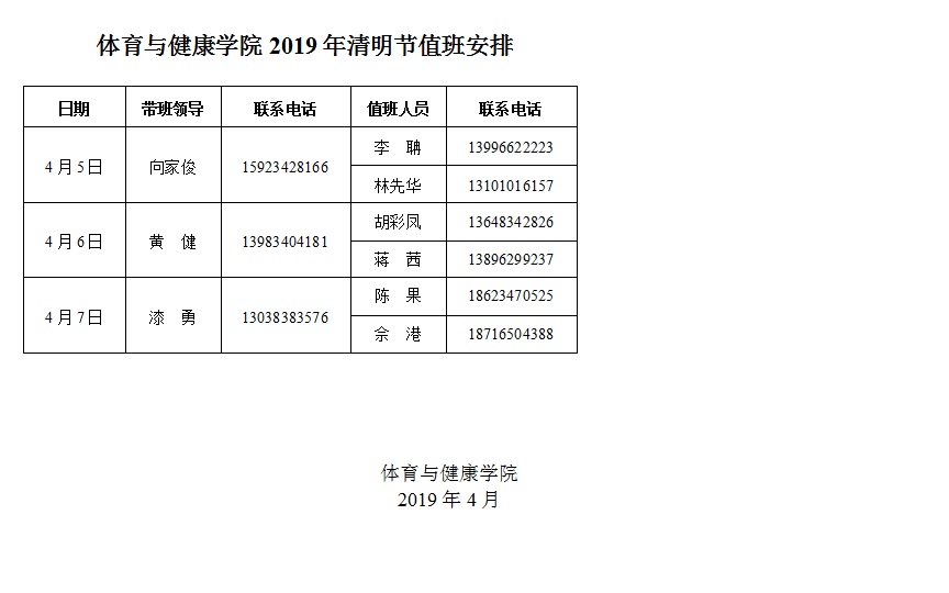 9728太阳集团2019年清明节值班安排