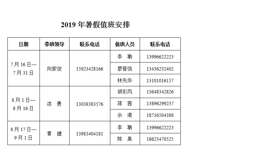 2019年暑假值班安排