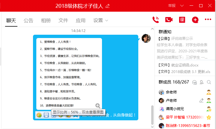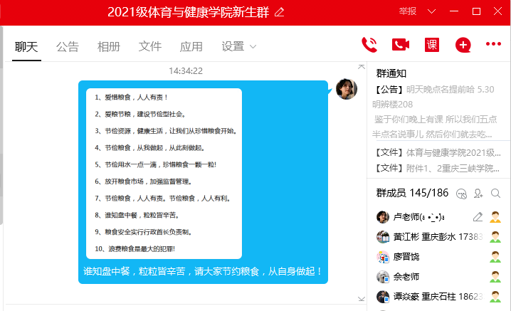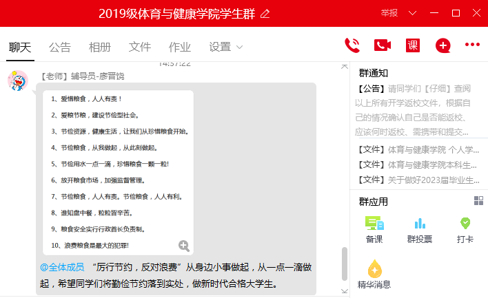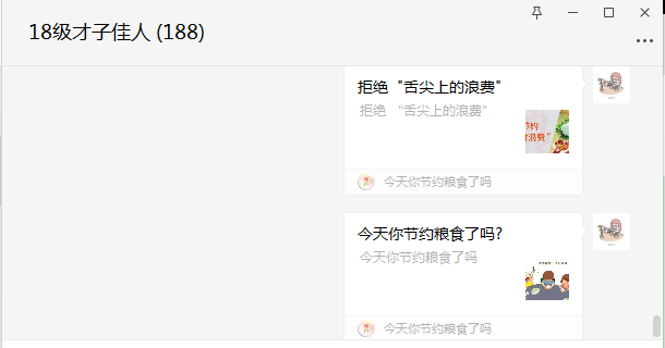 一粒米、千滴汗,粒粒粮食汗珠换!尽管我国粮食生产连年丰收,但对粮食安全还是始终要有危机意识。为强化学生节约粮食、珍惜粮食的精神意识,我院通过召开“粒粒皆辛苦、滴滴全是爱”主题班会、“厉行节约、反对浪费”主题周前会、QQ群转发“珍惜粮食”宣传标语、微信群转发相关“节约粮食”主题文章等形式,深入贯彻学生节约意识,让学生明白节约是一种美德,从身边的小事做起,节约一度电、一滴水、一粒米入手,养成勤俭节约的好习惯。
